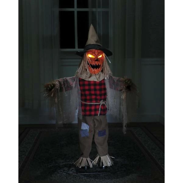 Make way for a very special Scarecrow with a message for you! This 36-inch Twitching Scarecrow Animated Prop will add a menacing air of mystery to your haunted scene! His Arms Wave back and forth, his Head with Yellow Light-up Eyes Turns, and his Orange Pumpkin Face with a Jagged Mouth Moves while he Speaks 5 different eerie Phrases: