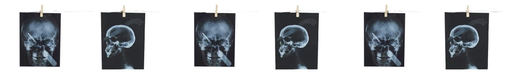 Photo cards showing skull type xrays with embedded objects. 63 inches long with photo cards attached.