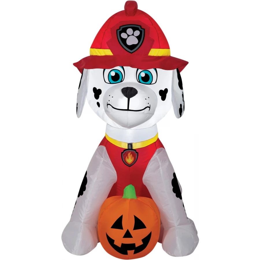AIRBLOWN MARSHAL JACK O LANTER. Airblown Marshall with Jack-O-Lantern will add fun to your Halloween yard decorations and the kids will be delighted! Airblown gives your decor maximum impact with minimum effort and it comes with everything you need for quick and easy set-up. You just stake it down and plug it in. Lights up with clear LED lights Self-inflates in seconds Deflates for easy storage Made of plastic and polyester Fabric,80%,Electronics,10%,Plastic,10% Measures approximately 36 inches tall, 29 inches wide, and 20 inches long.