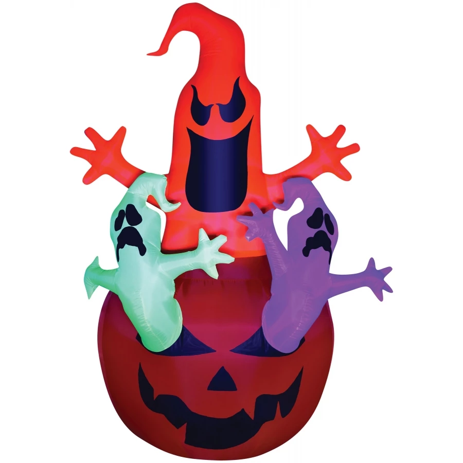 AIRBLOWN PUMPKIN W NEON GHOST. Airblown Pumpkin Jack with Neon Color Ghosts Trio scene stands almost 7 feet tall! Lights up and self-Inflates in seconds. Includes black light spotlight, 4 base stakes, 4 tether stakes, 4 nylon tethers, inflatable unit. ETL listed. Indoor/Outdoor use. Can be used in the daytime too!