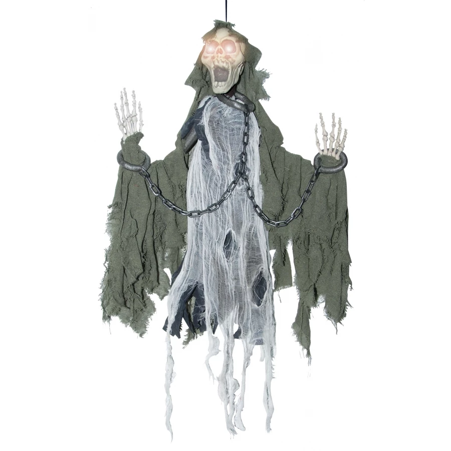 ANIMATED REAPER IN CHAINS. Woah! This one is sure to send you running! Light up eyes, slashing hands, and laughing sounds. Height 36″ x width 33.5″ x depth 4″. Requires 3 AA batteries (not included). Sound activated.