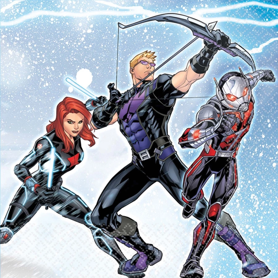 AVENGERS LUNCH NAPKINS. Superheroes save you from super spills with our Avengers Beverage Napkins! These awesome paper napkins feature a striking image of Thor and his trusty hammer Mjolnir in action on a light blue background. Comic book-styled, these Avengers Beverage Napkins get you ready for your superhero-sized party. 16 2-ply napkins per package.