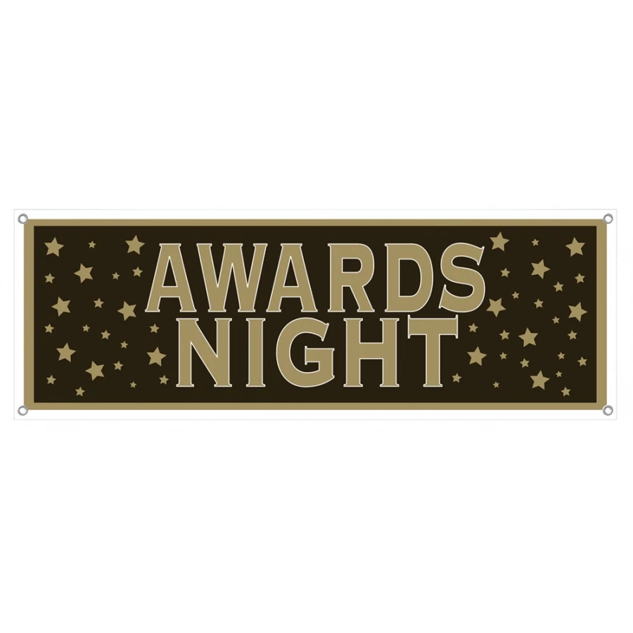 AWARDS NIGHT BANNER 21in X 5FT. A great banner for any awards night parties or any time you are honoring someone special. Gold-bordered banner with gold stars and the words “Awards Night” on a black field. Comes with 4 grommets and is all-weather use. The item measures 5′ x 21″.