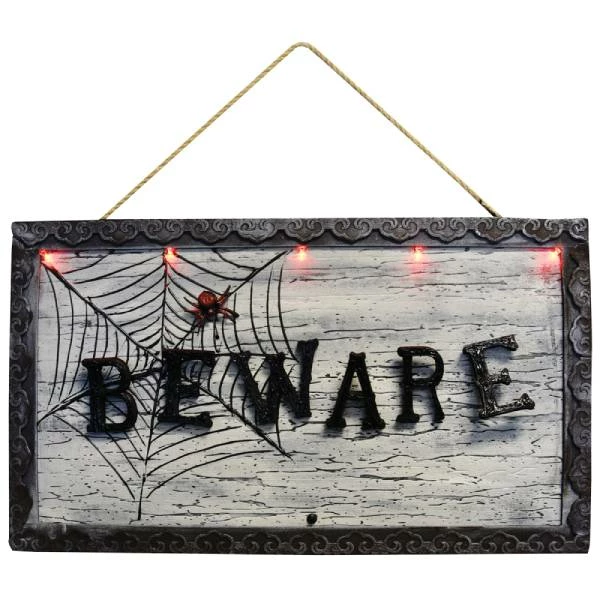 Welcome party guests into your home haunt with this spooky hanging sign that has lights and sounds. You’ve been warned – this scary wall décor will add a chilling touch to your room. This light up sign will be the perfect addition to your Halloween home.