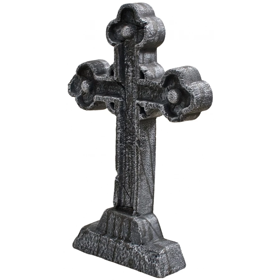 CELTIC CROSS TOMBSTONE. Looks like the real thing! Lightweight polystyrene tombstone has realistic weathered-stone look, includes 2 plastic ground stakes. Perfect for any haunted house, graveyard or tomb! 24in tall x 16in wide x 3in deep.