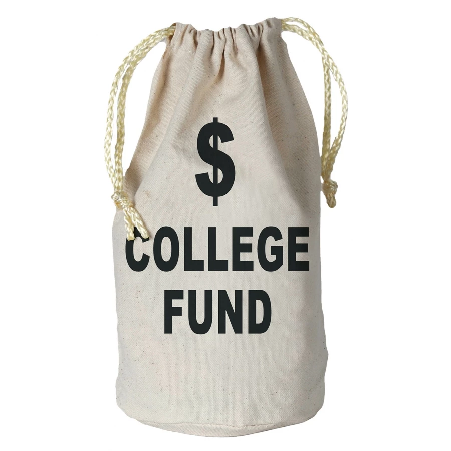 COLLEGE FUND MONEY BAG. The perfect gag gift for your favorite graduate or even great for a party favor at a graduation party. Let each participant put their contribution in for a great gift! Canvas. 8 1/2in x 6 1/2 in.