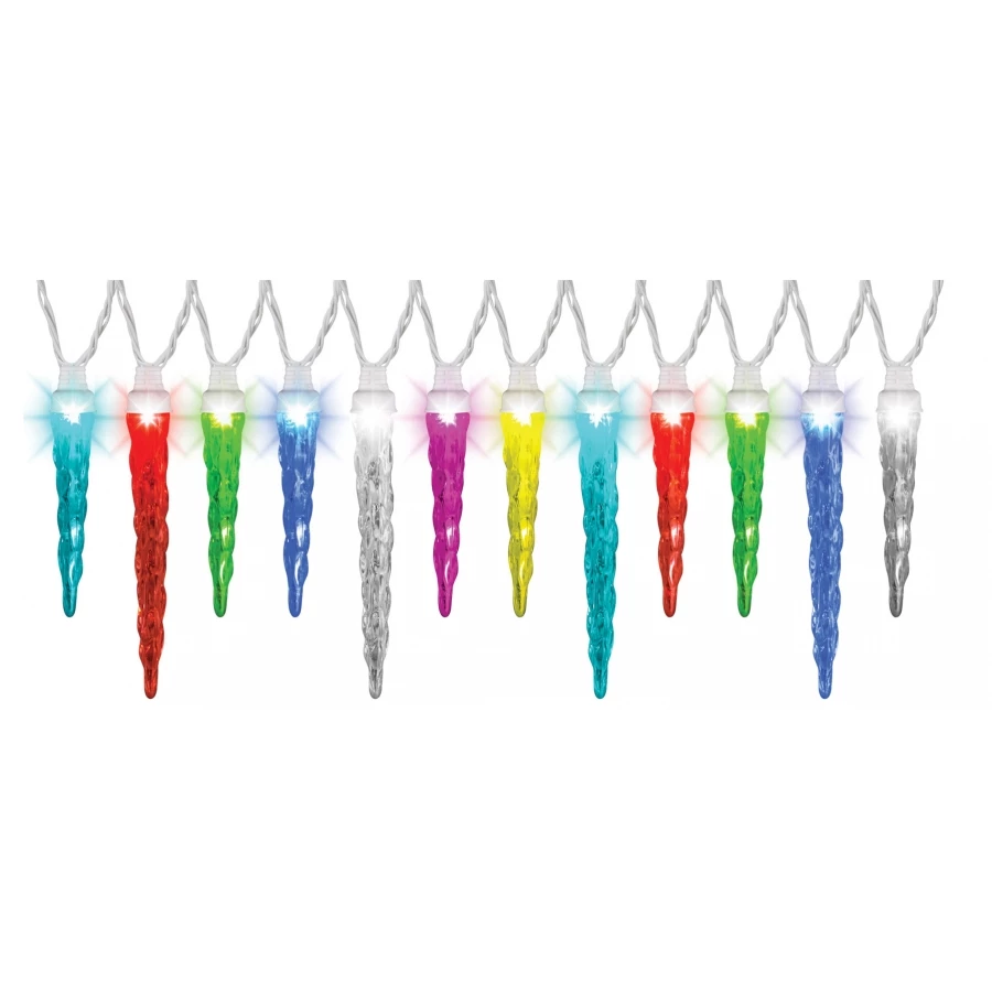 COLOR CHANGING SHOW MULTI. Amazing color-changing lights with icicles that are 5″ and 7″ long. Create a coordinated light show when you use several sets together! Total of 24 energy-saving LED lights. 24.5 foot string length, 23 feet of lights.