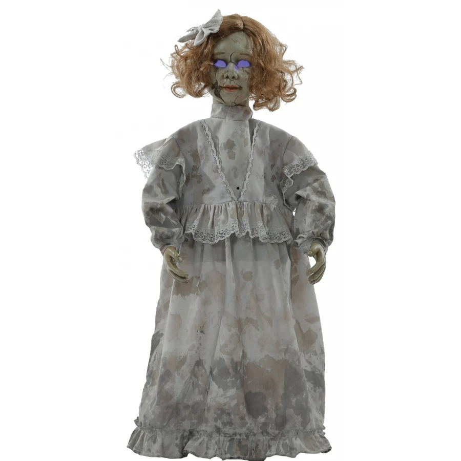 CRACKED VICTORIAN DOLL PROP. The perfect addition to any haunted house or horror-themed party! Standing at 32in tall, the hollowed-out eyes of this static dreadful doll prop will glow an eerie blue as she says one of five phrases with each activation of her motion/light sensor such as -(Giggle) I just was thinking how funny you would look without eyes, too.- Sally was mean to me, once. Now…she’ll never be mean again (giggle).- Ring around the rosy, pocket full of posies, ashes, ashes we all fall down.- Hello there.(giggle), I see you. Features easy quick-connect push-button assembly and posable arms. Requires 3 AAA batteries (not included).