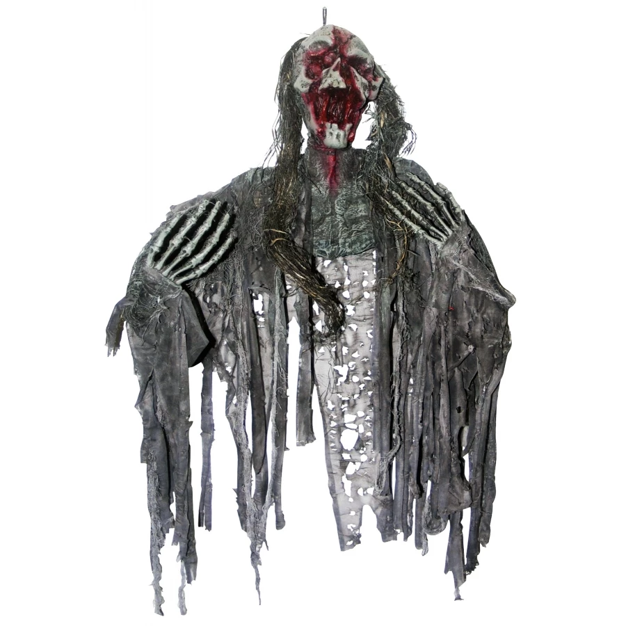 CREEPY ZOMBIE. Creepy Zombie hanging figure with straw-like hair and gauzy drapes that will move with every breeze! Bloody skeleton face and bony hands create a spooky look that is perfect for your next haunted gathering! Size: L37″ X W54″ X T7″
