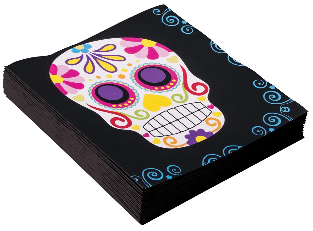 A great party accessory for your Day of the Dead event! Very colorful napkin with vibrantly colored sugar skull on black field. Item measures 10 X 10in and one package has 16 pcs.