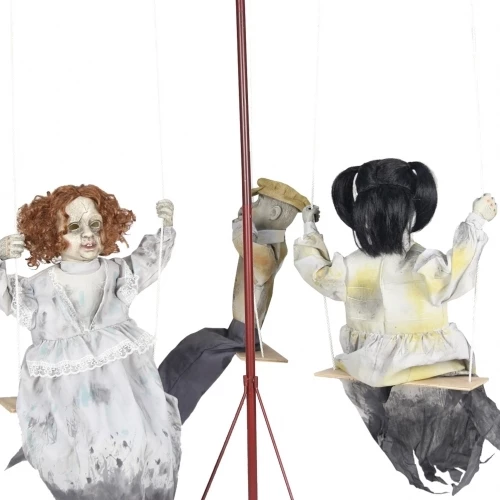 What is more chilling than three forgotten dolls from yesteryear slowly riding a merry-go-round for an eternity? This eerie prop is the perfect way to turn your home into a haunted mansion or haunted playroom. Creepy music plays at the merry-go-round goes round and round. Prop includes red iron frame merry-go-round with three swings and three dolls dressed in distressed Victorian era clothing with cracked faces. Add this animated prop to your indoor Halloween decorations to leave a haunting impression. Animations/sound effects: Eerie music with volume control, Merry-go-round spins around. Activation options: Steady-on, Infra-red sensor (works up to 6.5′ feet away & works in all lighting conditions), Step-here pad (included). Power: UL power adapter that plugs into any standard outlet. Materials: Iron, PVC, polyester and cotton. Assembly required.