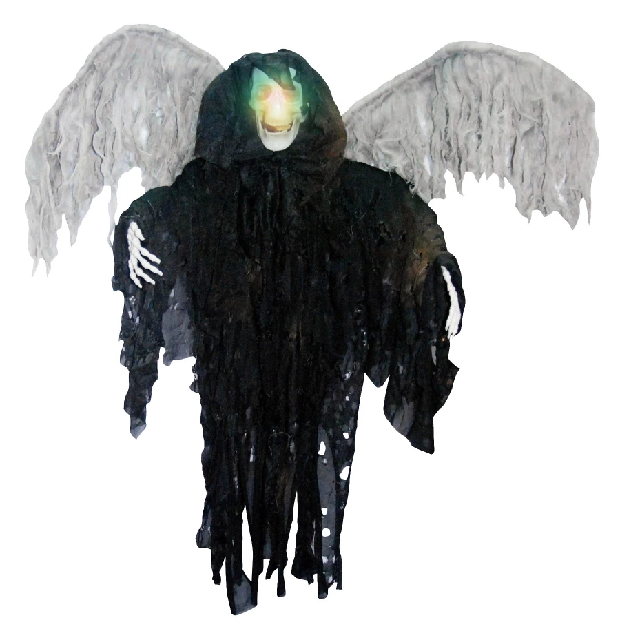 HANGING BLACK WINGED REAPER. 3 foot tall hanging reaper with light up color changing skull and posable arms. Shredded cloth costume design with attached poseable grey wings. Requires 3 LR44 batteries (not included). Measures approx. 36in x 42in x 4in.