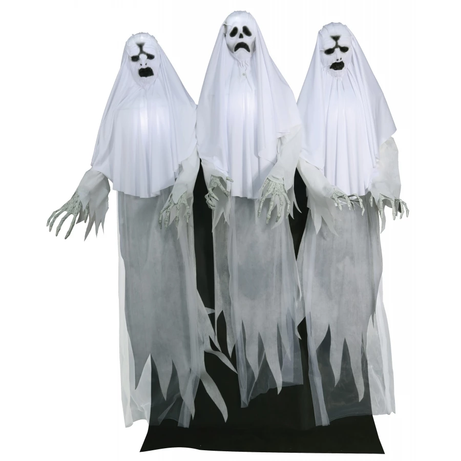 HAUNTING GHOST TRIO ANIMATED. Now you can have a whole gaggle of ghosts at your door or on your porch with The Haunting Ghost Trio! These three 6 foot Ghost characters have fabric-covered PVC heads with light-up faces & torsos, draped white fabric costumes, posable arms with creepy plastic long-fingered hands, and a black fabric drape to hide the easy-to-assemble frame. Plug in the UL power adapter into any standard outlet & choose from Steady-On, Infra-Red Sensor or Step-Here Pad (included) activation options to operate. Once activated, the Haunting Ghost Trio will begin moaning as their faces and chests light up with an other-worldly glow as each Ghost sways from side to side, wailing in eternal torment! The infra-red sensor works up to 6.5′ feet away & works in all lighting conditions – bright light to no light! Item includes volume control. Easy-to-assemble quick-connect poles. Assembly required.