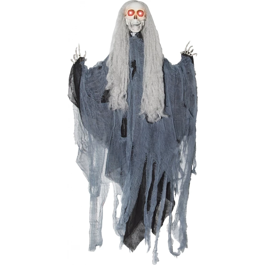 HEAD DROPS REAPER. A great new prop that is sure to make a great impression at your haunted house or your home haunt, this head dropping skeleton reaper has to be seen to be believed! Reaper with gauze draping with a moving head, lights and sound. Uses 3 AA batteries which are not included. 35.4 x 27.6 x 5.9 in. Sound activated.
