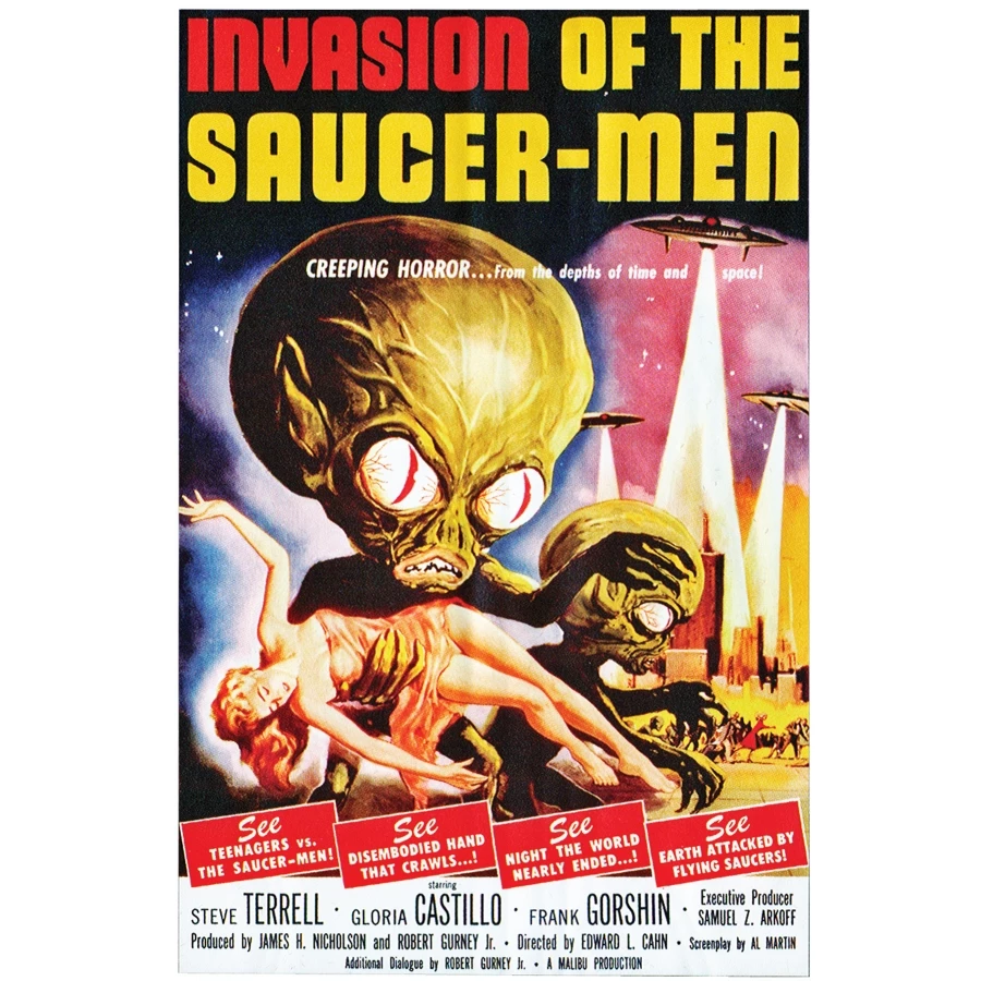 INVASION OF SAUCER MEN POSTER. Vintage horror movie post a cling poster of th e classic, Invasion of the Saucer Men. 24 in x 36 in.