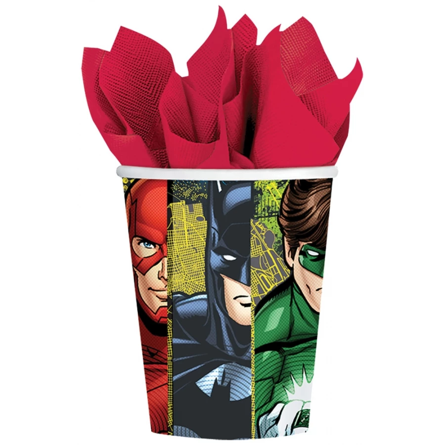 JUSTICE LEAGUE 9 OZ CUP 8 PACK. DC Justice League Package includes (8) paper cups to match your party theme. Cups are versatile enough to serve warm or cold beverages. Each holds 9 fl. oz.
