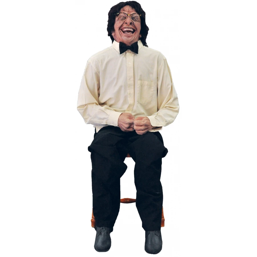 LAUGHING MAN ANIMATED PROP. Life-sized animated prop depicts a creepy man who shakes with crazy laughter! Just the right prop to accent your haunted scene! Made of foam-filled latex, this full-standing figure includes a CD with scary sounds. Just provide your own boom box. Prop plugs into any 110 outlet. Approximately 55 x 17 x 9 inches.