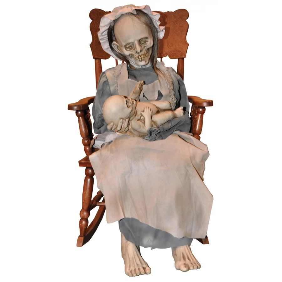 LULLABY ANIMATED PROP. Ghostly mom and child rocks back and forth singing softly a lullaby. Unnerving! Soundtrack CD is included. You provide chair and CD player. All electric! Clothing may vary. Box measures 29 x 17 x 15, Weight 22 pounds Supply your own rocking chair. Foam filled latex on a steel armature.