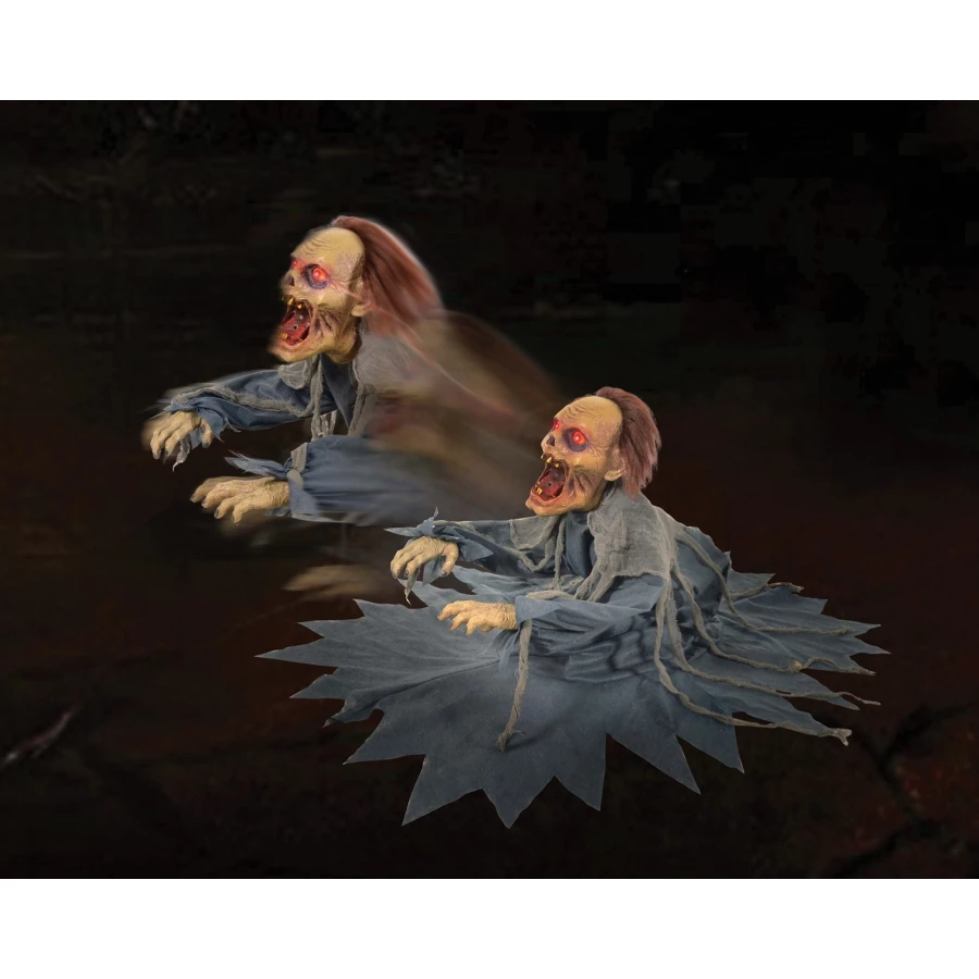 LUNGING ZOMBIE REAPER. Small lunging zombie character featuring fabric costume, blow-molded head, bendable wire arms with latex hands, yellow LED eyes and scary sounds. Optional power methods: Battery-operated or UL adapter plug or try-me foot pad. Requires 4 AA batteries not included. Figure is approx. 10in x 6in x 6in, attached to a base that is slightly larger.