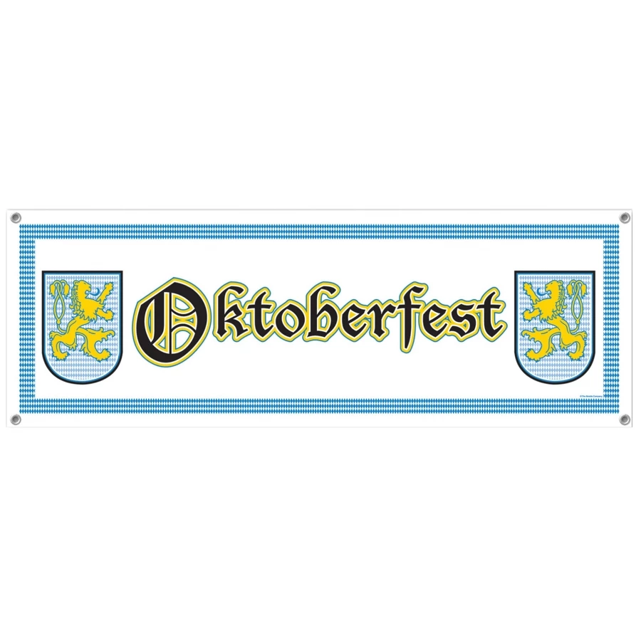 OKTOBERFEST SIGN BANNER. A great banner for your Oktoberfest celebration. Banner is white with blue/white border around 2 insignias and the word Oktoberfest between them in the middle. Polyethylene. 5ft x 21in. Good for both indoor and outdoor. Comes with 4 grommets for hanging.