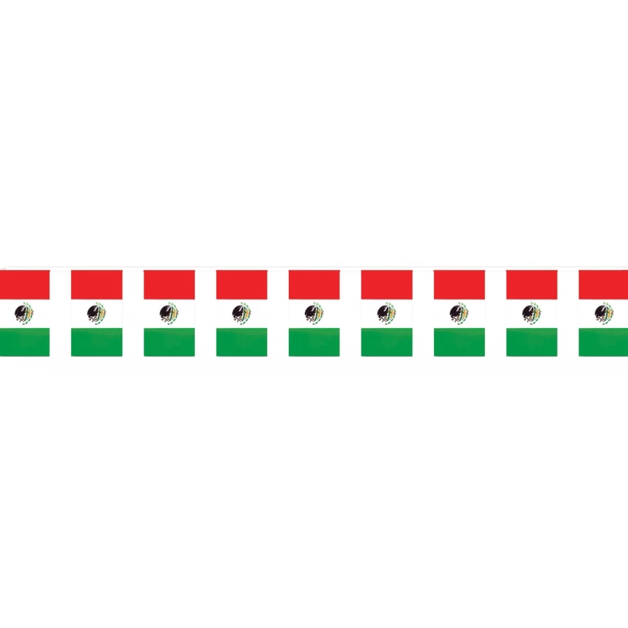 OUTDOOR MEXICAN FLAG BANNER. The perfect banner for your Cinco De Mayo celebration! Polyethylene. 30 flags on a string. One string per item. 17in x 60 ft.