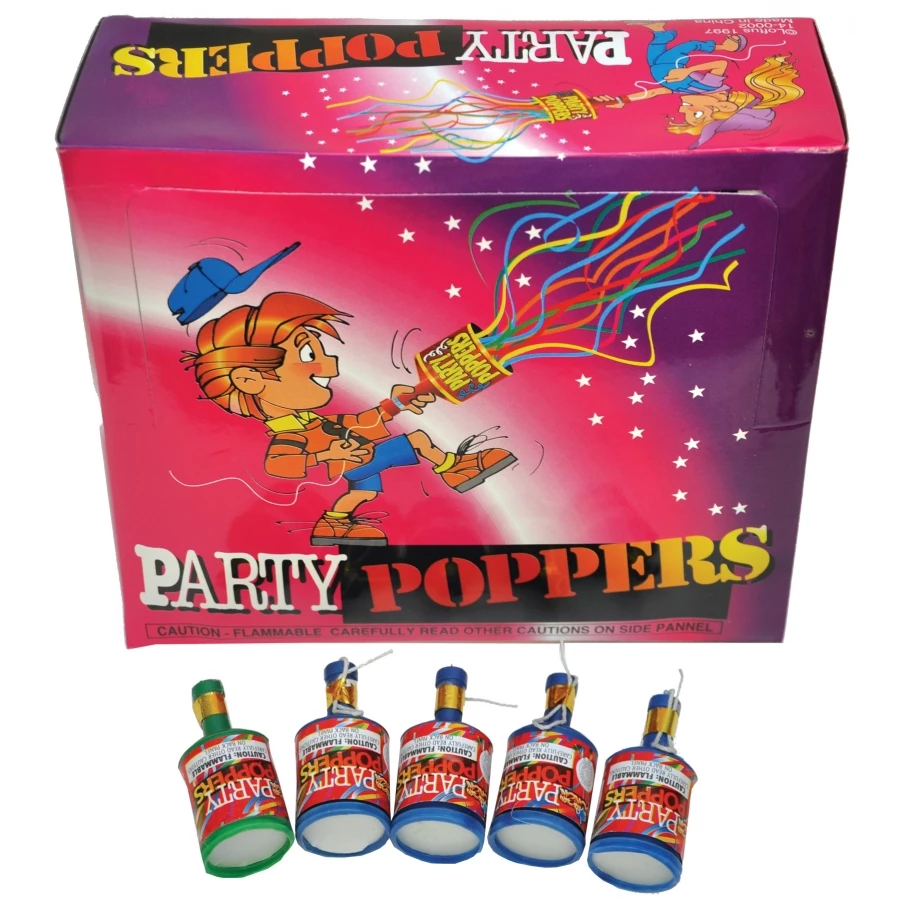 PARTY POPPER PKG OF 72. Pull the cord on these champagne style bottles and with a loud pop, out flies a multitude if colorful paper streamers. 12 poppers in one pack. Great for any party, like New Year’s Eve!