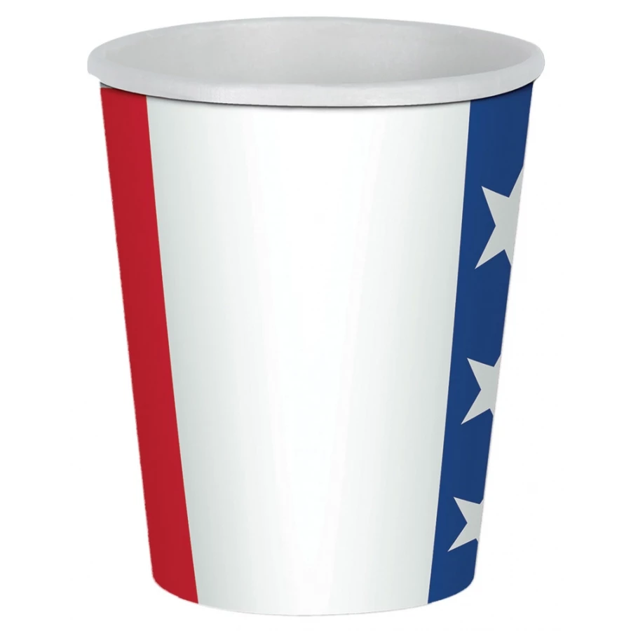 PATRIOTIC BEVERAGE CUPS 9 OZ 8. Great cups for any patriotic event like 4th of July, veteran’s events or just about any holiday! 9 oz cups, red, white and blue with stars design. 8 cups to a set.