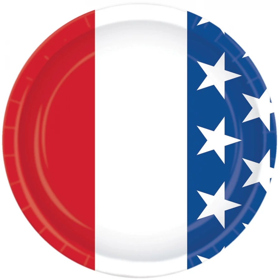 PATRIOTIC PLATES 7IN 8PC. The perfect party plate for any patriotic event from the fourth of July to armed forces and veterans gatherings. 7 inches, Red, White and Blue stripes with stars on plate. 8 to a package.