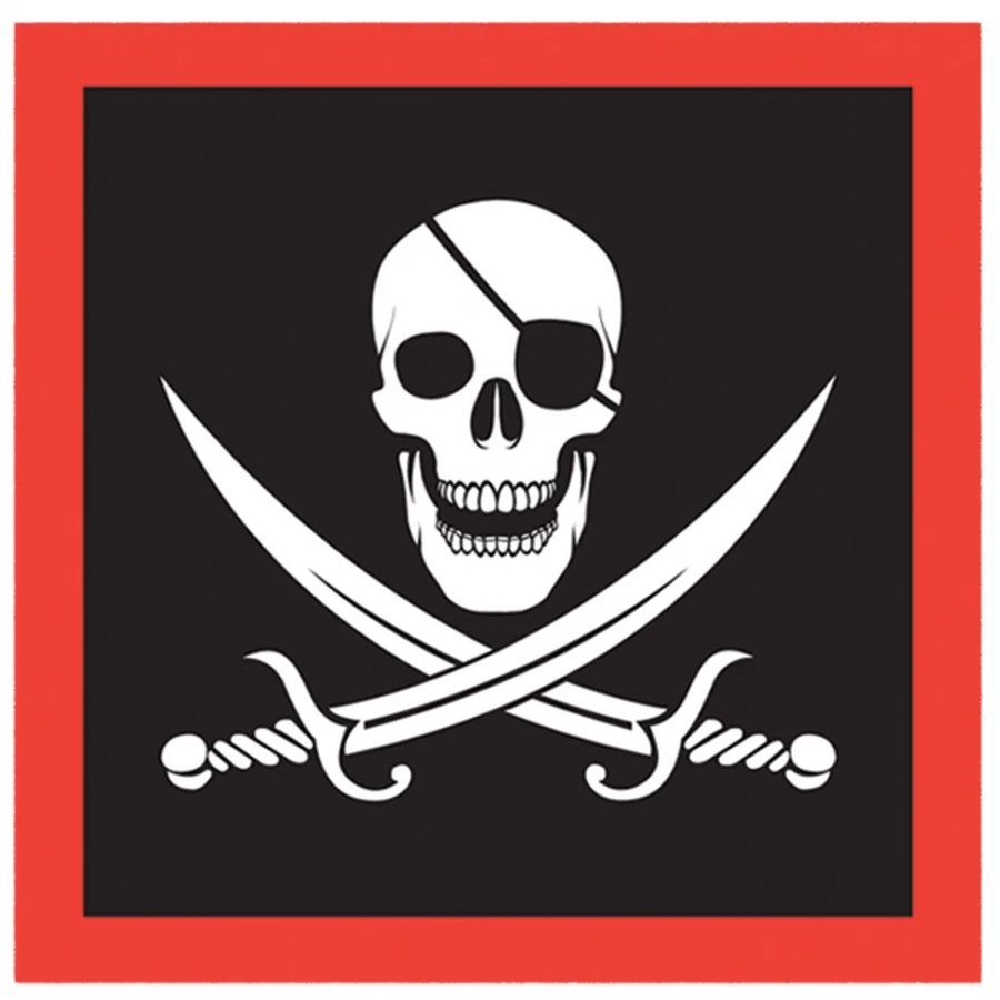 PIRATE NAPKINS 16 PC. Awesome pirate theme napkins that will go with any pirate theme event or maybe a child’s birthday party. 2-ply napkins with red border, white skull and cross swords on a black field. Napkins come 16 to a package.
