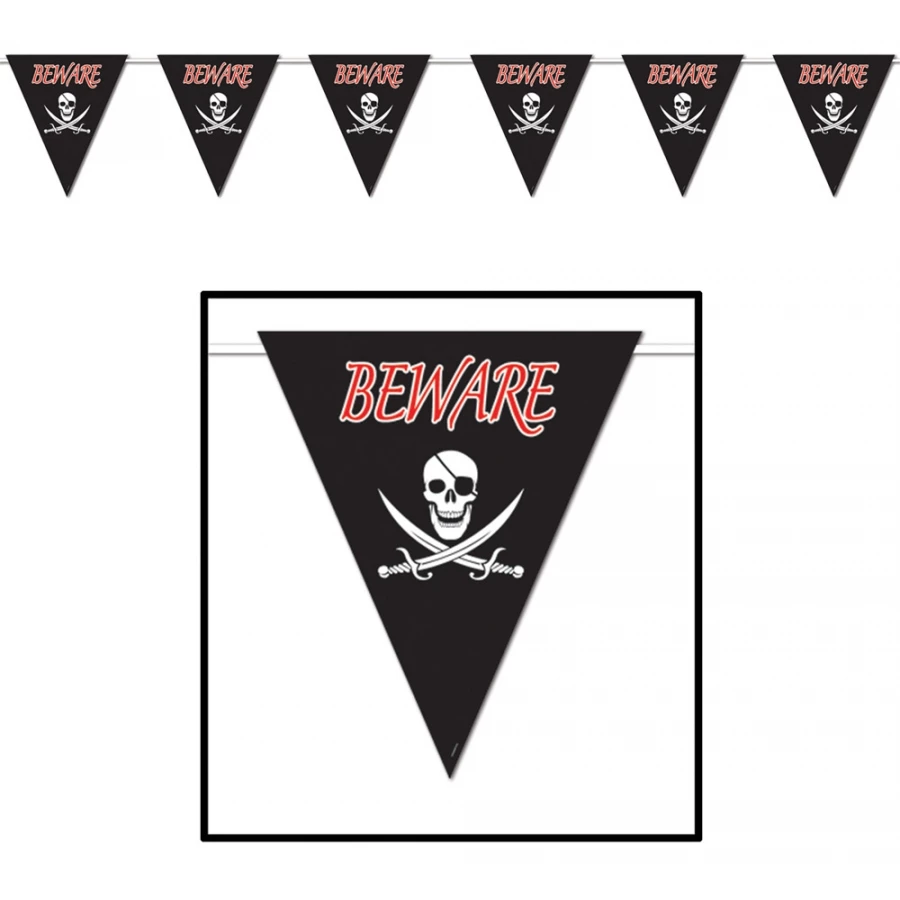 PIRATES BEWARE BANNER. Arrrrrr This is a great banner for any pirate party! Item consists of one string of six pennants that each have a white skull and crossbones on a black field with the word “Beware” above it. Item measures 23″ x 12′.