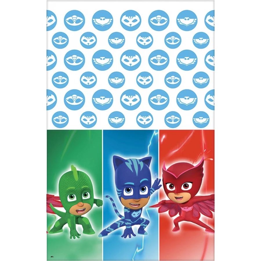 PJ MASKS 1ST TABLE COVER. Invite the fun PJ Masks heroes to your child’s birthday bash! Guests will be entranced by this. Decorate for your party while keeping your tabletop nice and clean with the Tablecover. Measures 54 inches high by 108 inches wide. Add even more color to your party area by covering surrounding tables with solid-color tablecovers that coordinate with your party theme.
