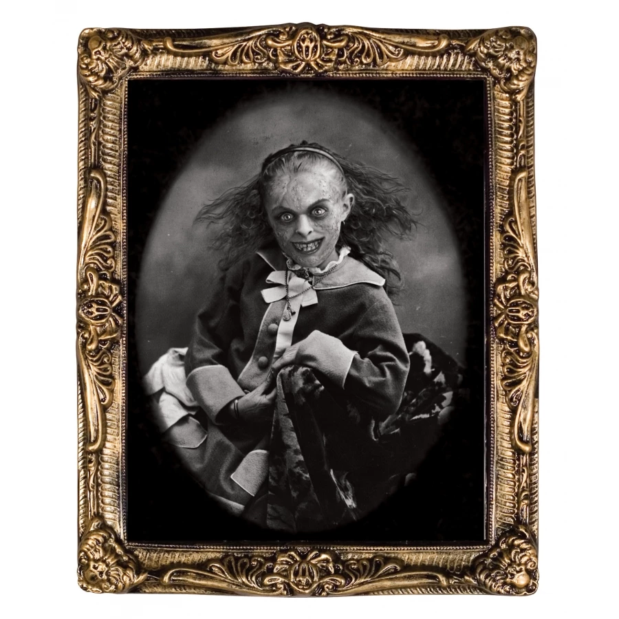 PRETTY POSSESSED 13 X 15 PRINT. Take a glance at this darling child, take another and she is possessed! The image has a scratched antique appearance, giving the sepia-toned effect of old photography, but with a holographic twist! Portrait measuring 13 inches by 15 inches. Includes a molded plastic frame.