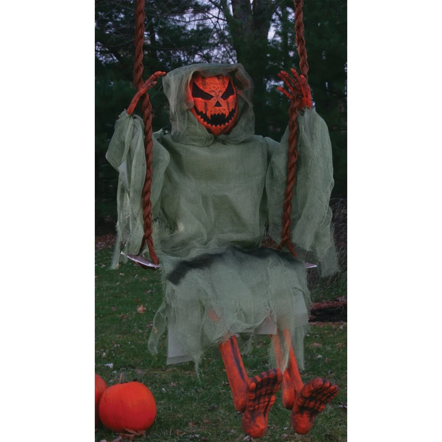 PUMPKIN 36 INCH SWINGING DEAD. This evil jack-o-lantern man will frighten anyone that walks by! Prop includes bright orange pumpkin man sitting on a swing. No assembly required! All you have to do is open the box and hang! Perfect for an easy or last minute Halloween prop! Includes 2 hooks for hanging. 36 inches tall
