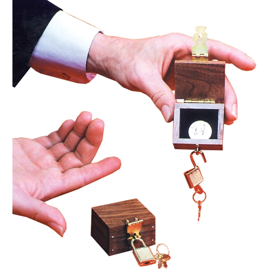 QUARTER GO. A quarter is borrowed and marked. This is placed under a handerchief and given to a spectator to hold. Next to a small, padlocked chest is shown, then placed on a spectator’s place on top of the small chest. First the spectator is requested to hold the hank containing quarter over the glass and at a magic command to drop the coin into it. A clink is heard when the hank is removed, the coin has vanished. Chest is now opened by the spectator, and as unbelievable as it may seem, the marked coin is found inside. Amazing!