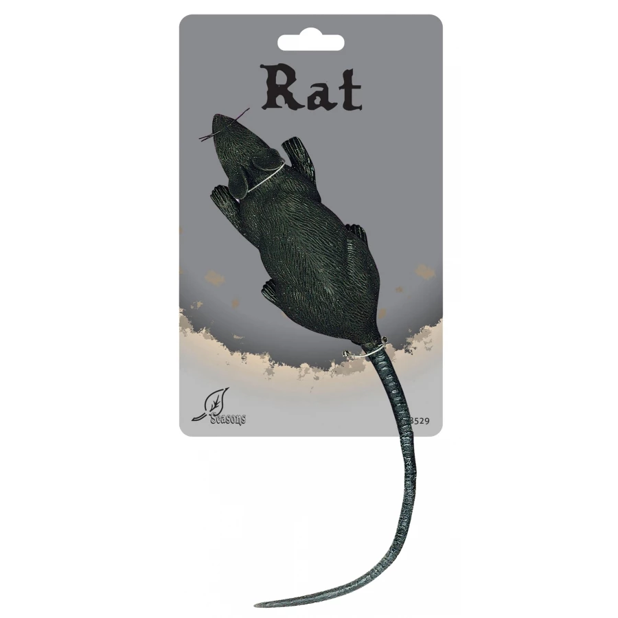 RAT CARDED. Your guests will be screeching and jumping on chairs! Black rat with long tail is 100% PVC but looks very realistic. 12 inches long including the tail. Tied on to a backer card.
