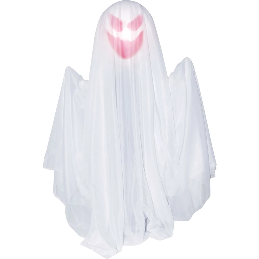 RISING GHOST. A fantastic new ghost prop that will sure to be a hit this Halloween whether you use it in your home haunt, your haunted house, or just on your porch to scare the kids! Moves up and down, eyes light up and has sound. Uses 4 AA batteries which are not included. 27.6 x 19.7 x 6.3 inches. Sound activated.