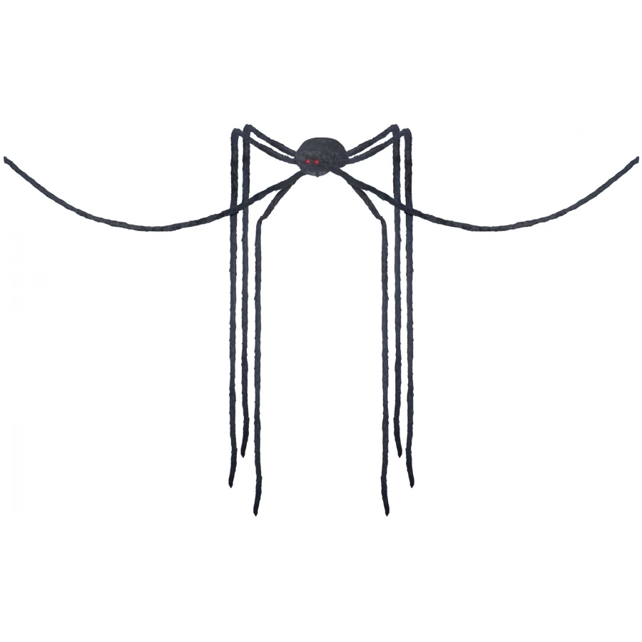 SPIDER BLACK LONG LEGS. Spider with Long Legs. This is one serious daddy long leg prop! Long legged spider is a ployfoam prop, with polyester fur covering, and sparkling red eyes. Legs measure 25 feet across! Body of the spider measures 13 inches x 17 inches x 6 inches. This is one big spider measuring over 11 feet wide. Eyes do not light up. Size: length 17 inches x width 132 inches x height 6 inches.