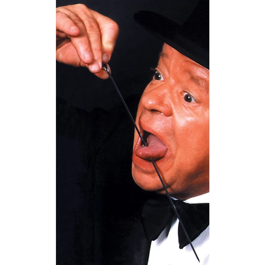 SPIKE THRU TONGUE. The magician appears to thrust a 10″ long thin chrome spike thru his tongue as the audience watches in wonder. It is then removed without blood or pain. You won’t believe your eyes.
