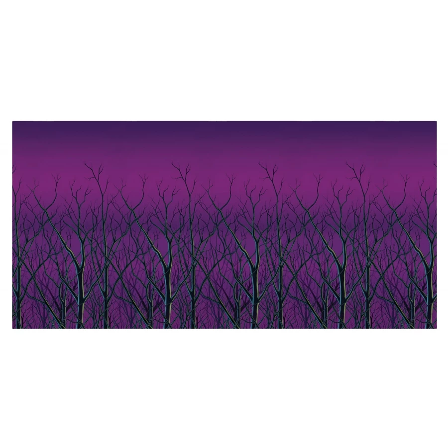 SPOOKY FOREST TREETOPS BACKDRO. This spooky forest backdrop is great for photo-ops or simply decoration at your halloween party or haunt. Spooky forest scene with a vivid and striking purple sky. PEVA. 4ft x 30ft. Attach as desired. Indoor/Outdoor use.