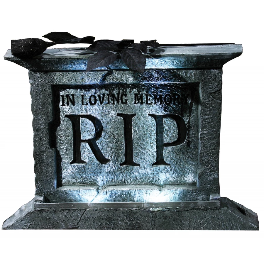 TOMBSTONE PEDESTAL 22 W/ROSE. Granite-look 22 inch light-up tombstone with pedestal with white strobe lights that require 3 AAA batteries. Batteries not included. Lightweight polyfoam. Width is 2 1/2 inches.