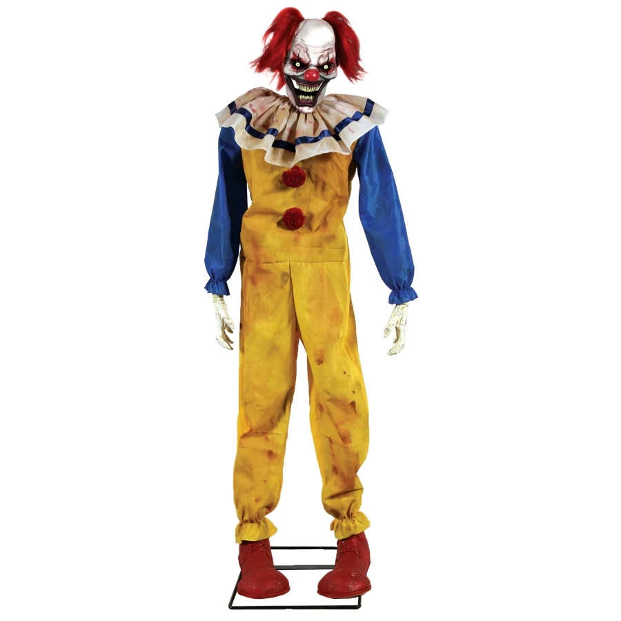 TWITCHING CLOWN ANIMATED PROP. Scary looking evil clown prop plugs into any outlet! The body rotates at the waist, arms flop, and the head swings on a spring for a very unnatural look! The spring -loaded jaw opens and closes as though the clown is cackling with evil joy. Sound track is included. Choose from Steady-on, Sensor, or Step-Here Pad (included) activation options. Eyes light up! Assembly required, complete instructions are included.