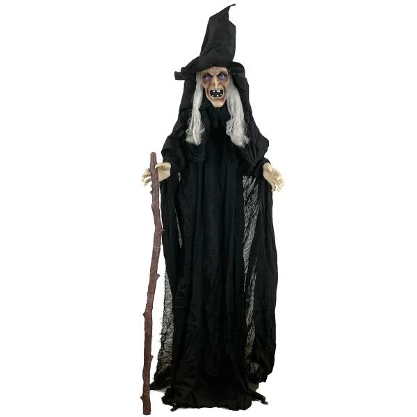 Get ready to hear, โHey! Did that witch just move?!โ This creepy Halloween decoration looks like an aged witch crouched over, holding her cane. But this witch moves โ just enough to freak people out! Trick-or-treaters and Halloween party guests will think their eyes are tricking them when they spy the witchโs movements. Add her to your Halloween decor for some spooky fun! Hands, face and base, plastic. Back of head is rounded. Clothing, polyester. 5 ft. Requires 3 “AA” batteries, not included.